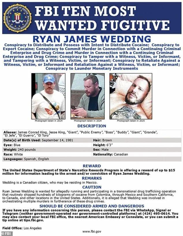 川普总统对墨西哥毒贩的持续军事压力取得成效。周五(1月23日),联邦调查局(FBI)正式宣布,已经抓获加拿大前奥运单板滑雪运动员、后转型为大毒枭的瑞安·韦丁(Ryan Wedding)。这位44岁的加拿大男子涉嫌领导一个跨国贩毒集团,与墨西哥锡那罗亚贩毒集团(Sinaloa Cartel)密切合作,被指控走私巨量可卡因并策划多起谋杀案。